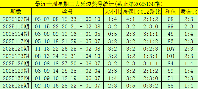 后离别析:最近10周星期三全小开出2次,一大一小开出8次,全通达出0次;全奇开出3次,全偶开出5次,一奇一偶开出2次,本期后区明慧两码03+05。
