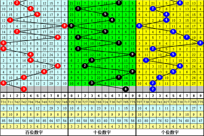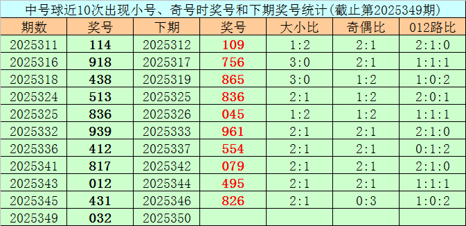 在中号球前10次开出小 号、奇号类型之后,其下期分离开出奖号:109、756、865、836、045、961、554、079、495、826,其中号码奇偶比为5:5,大小比为6:4,012路比为5:2:3。