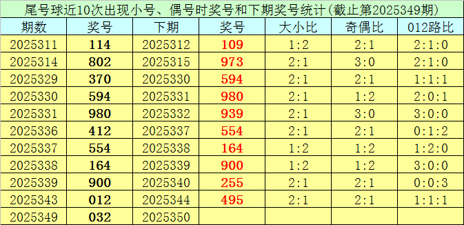 在尾号球前10次开出小 号、偶号类型之后,其下期分离开出奖号:109、973、594、980、939、554、164、900、255、495,其中号码奇偶比为5:5,大小比为4:6,012路比为5:3:2。