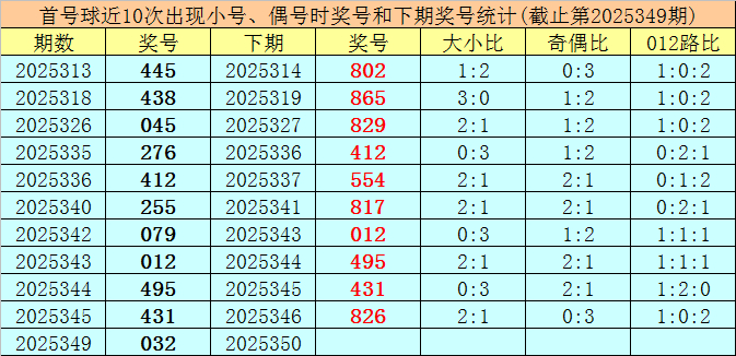在首号球前10次开出小 号、偶号类型之后,其下期分离开出奖号:802、865、829、412、554、817、012、495、431、826,其中号码奇偶比为1:9,大小比为6:4,012路比为1:3:6。